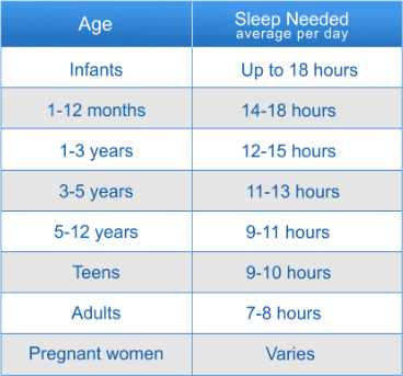 Most experts agree with the table below that shows the average amounts of sleep needed based on a persons age.