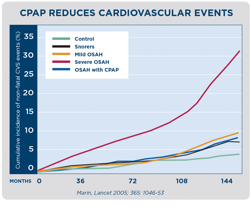 events compared to BMI adjusted controls and those with OSA on treatment as demonstrated in a 2005 landmark cohort study by Marin, Lancet [1]. As Figure A demonstrates, OSA patients undergoing CPAP therapy were far less likely to experience a cardiac event compared to individuals diagnosed with OSA who did not follow CPAP therapy protocol; 9% of treated patients vs. 30% of untreated.