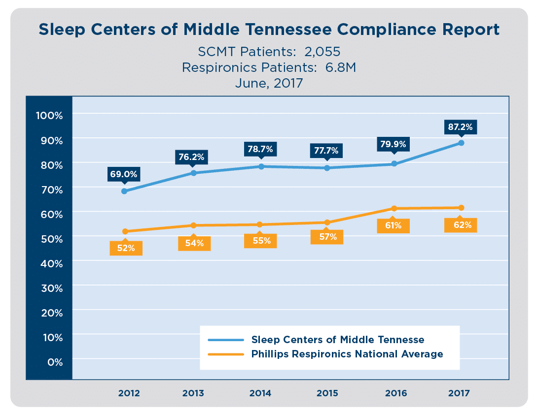 In an objectively measured study, our patients demonstrated treatment compliance of over 87% (national average is 62%). Figure B compares the compliance data after 90 days of treatment from Encore of over 2,000 consecutive BCBS patients treated with CPAP dispensed by Sleep Centers of Middle Tennessee to the complete national database of 6.8 million patients treated by DME companies.